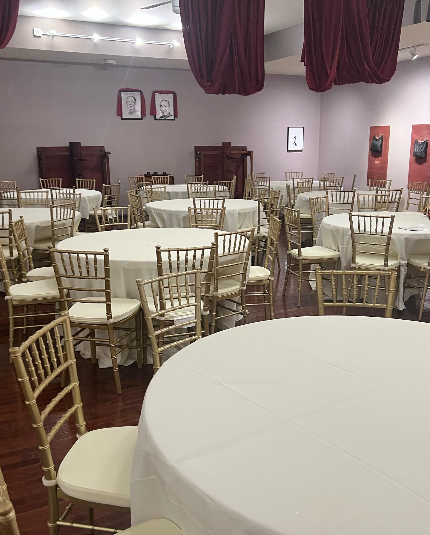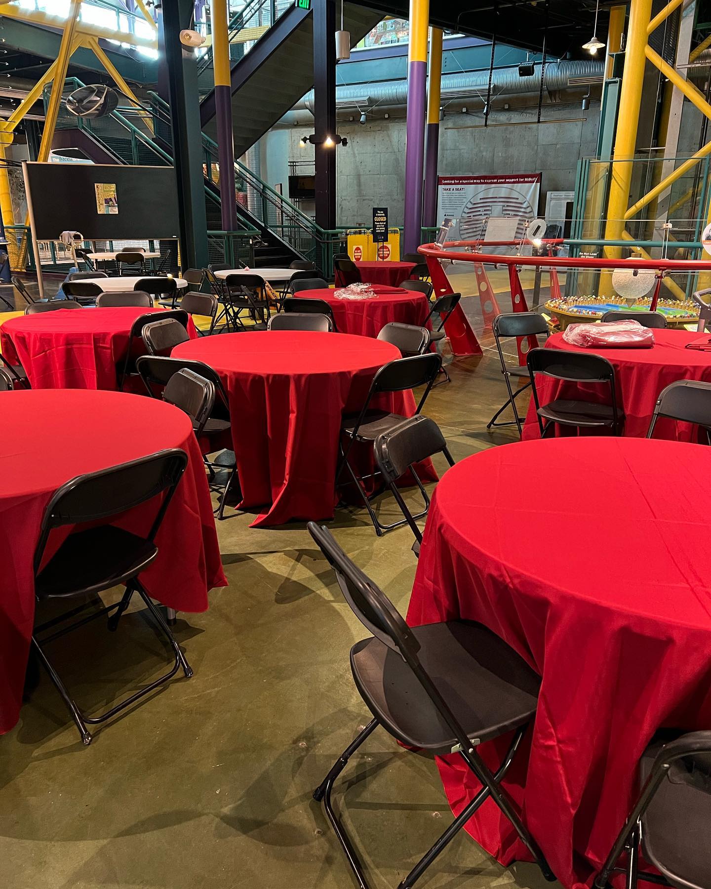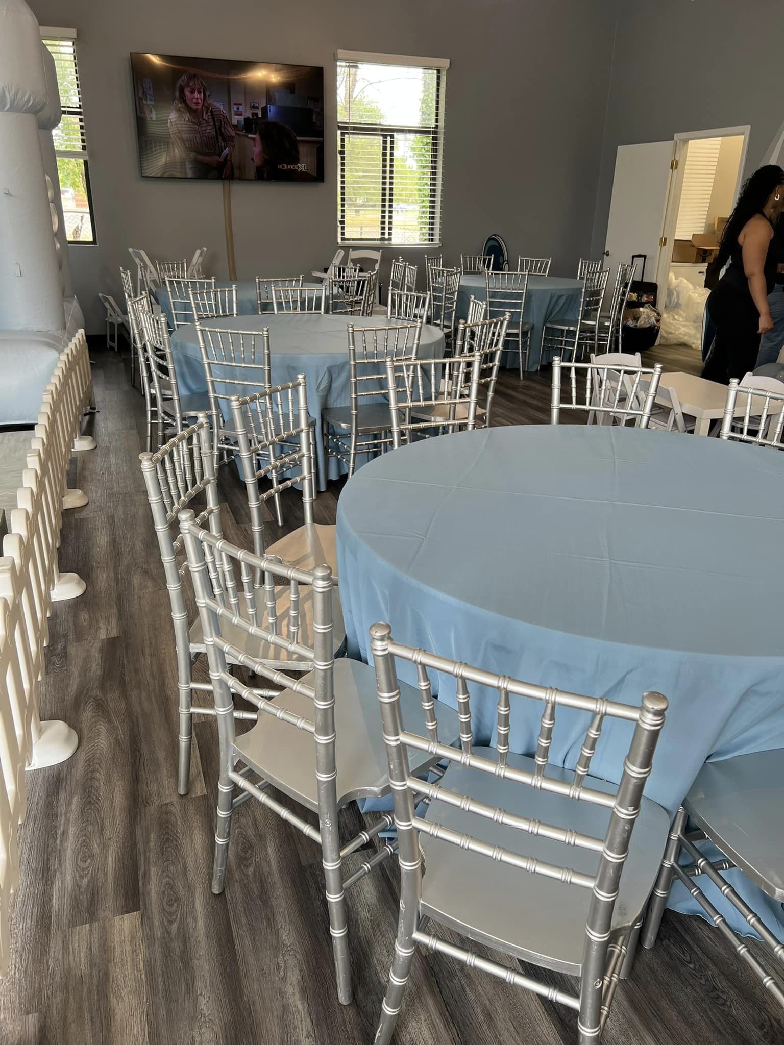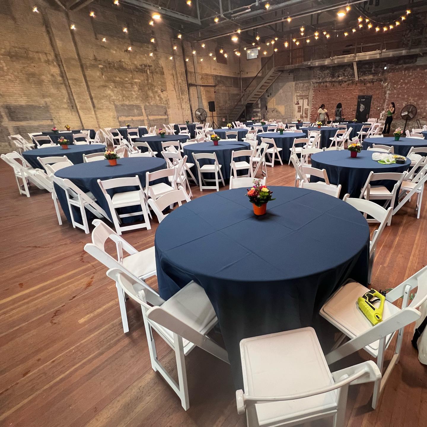 Please note that our tablecloth rentals are exclusively available when you rent our tables, chairs, or other items from our inventory, ensuring a seamless and cohesive look for your event. We do not offer separate tablecloth rentals or chair covers, but we do provide elegant chair rental options to complete your setup.