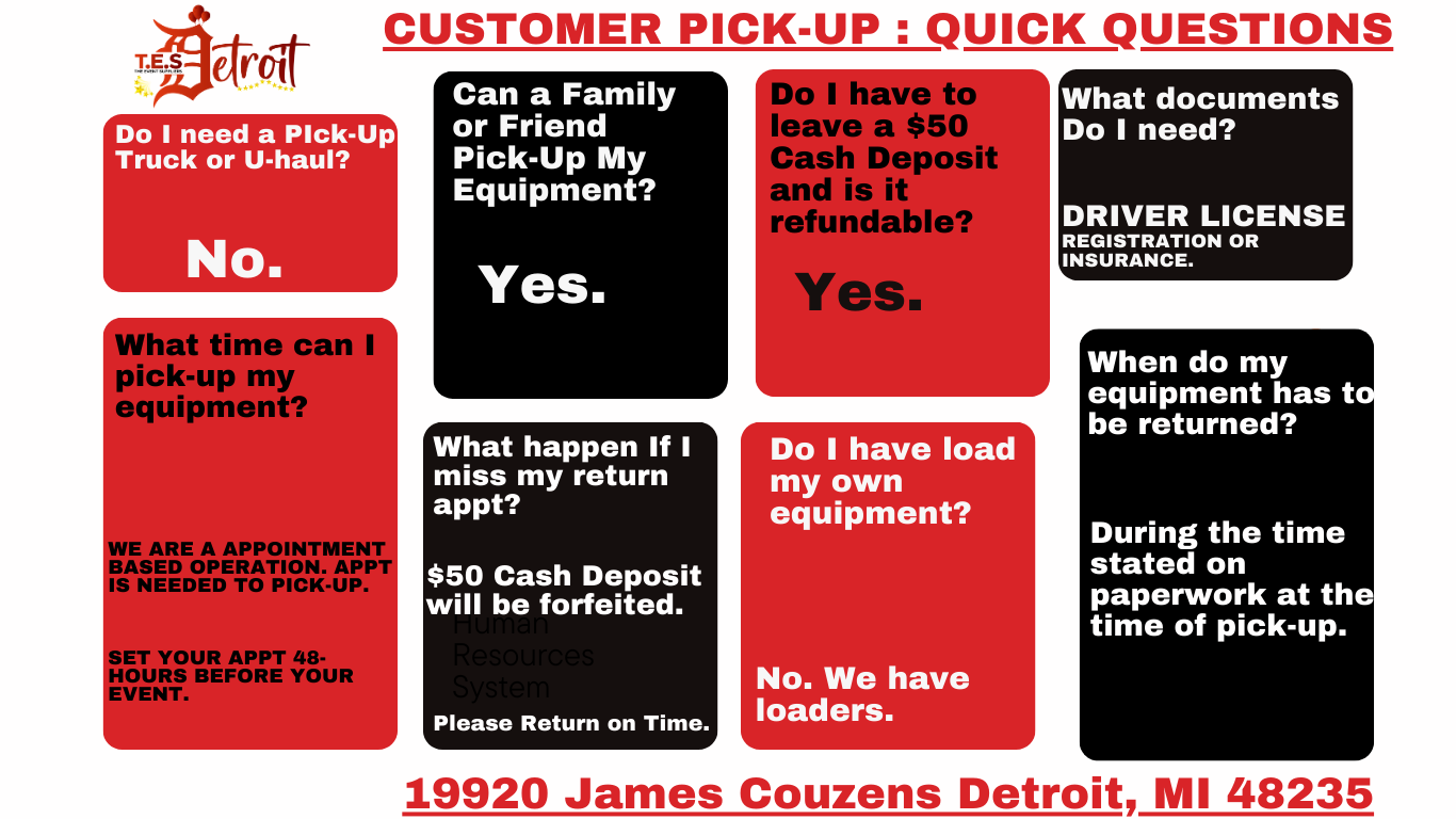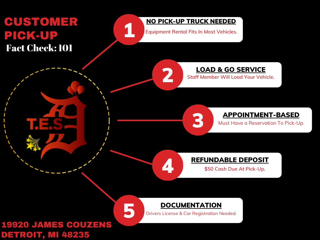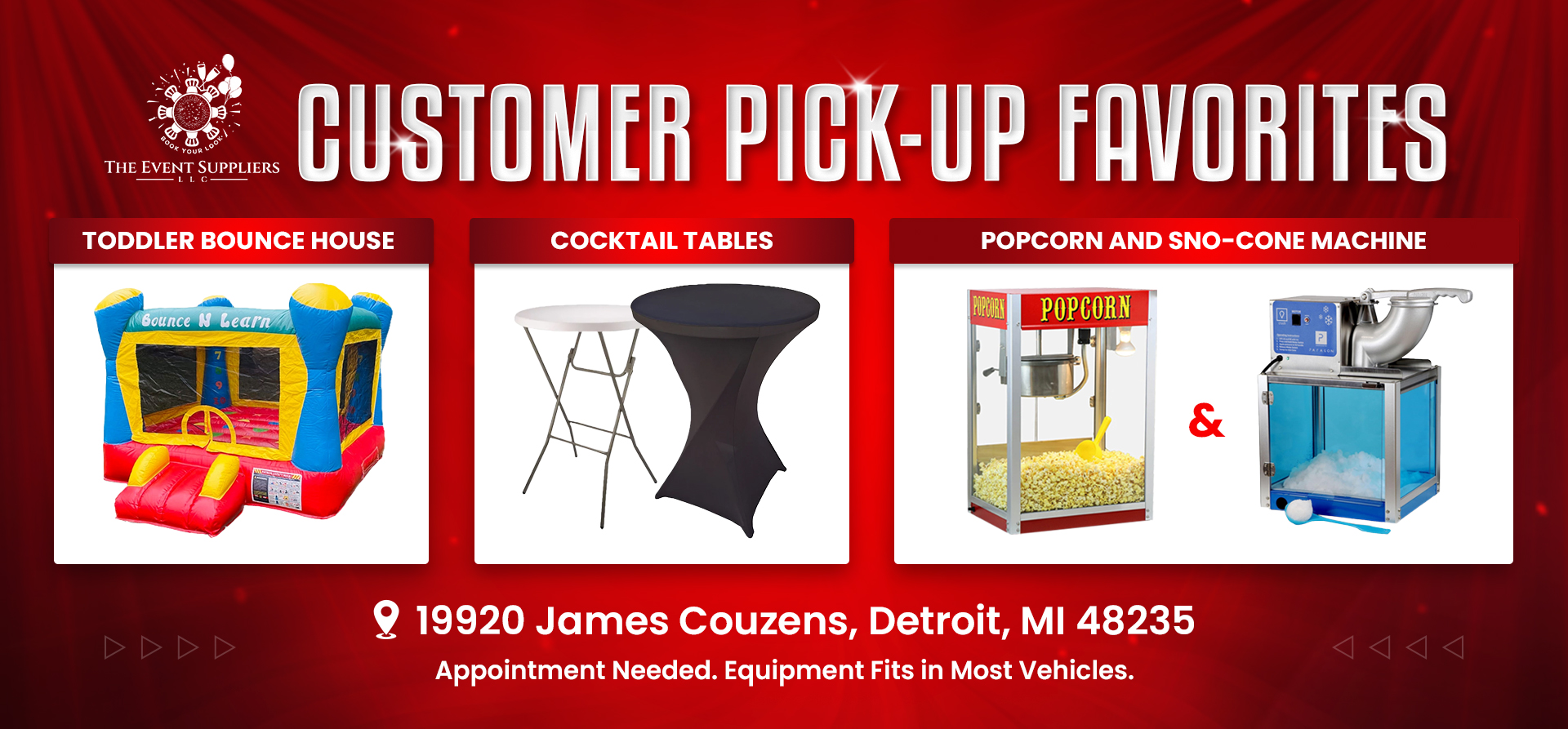 Allow yourself additional time for set-up and planning by requesting a 1-day early pick-up for a additional investment of $35. This option is more cost-effective than opting for a multi-day rental. Send a text message to 313-808-4746 to make your request.
