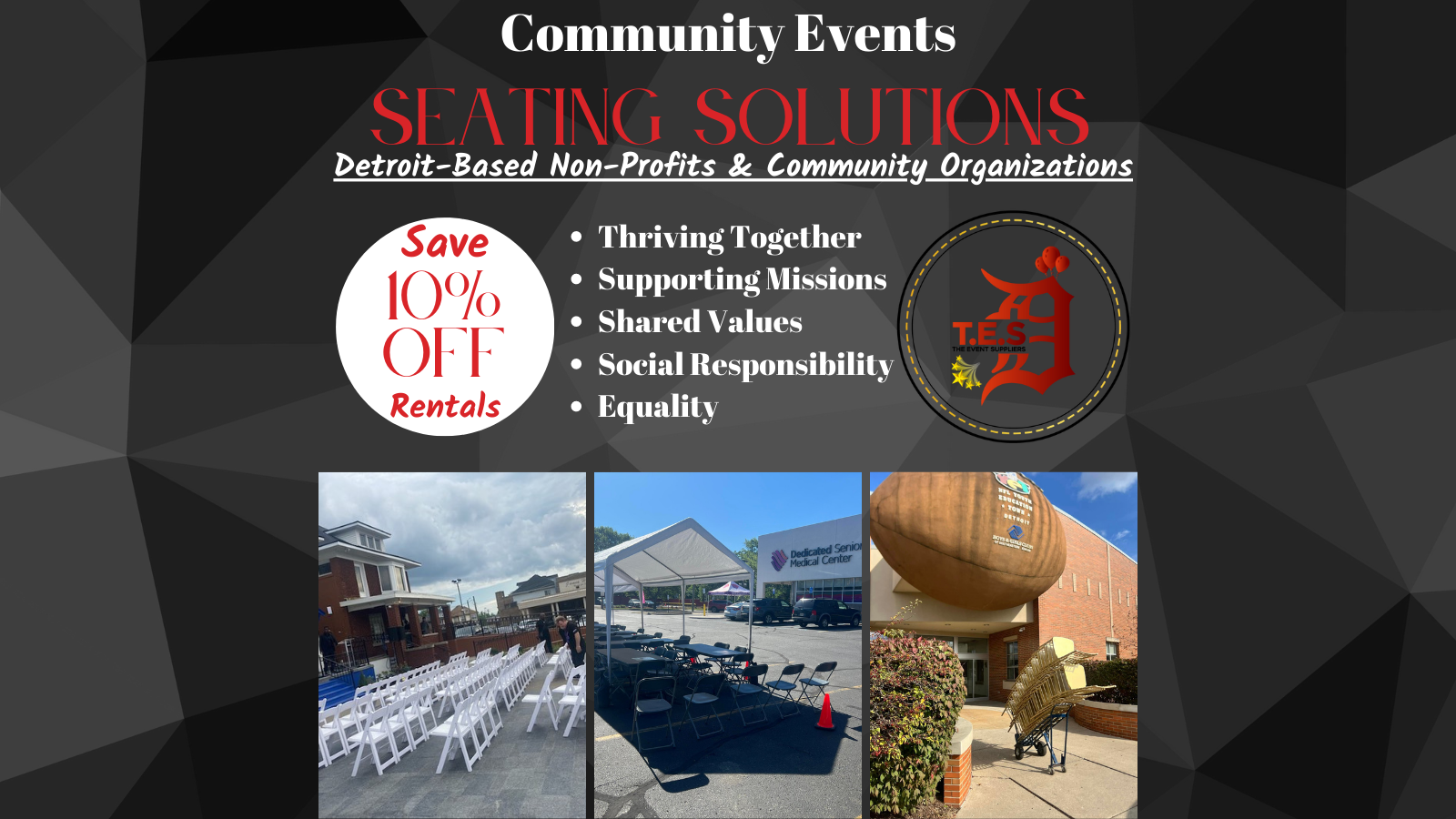 The Event Suppliers LLC is dedicated to serving the people of Detroit Community. We strive to treat all potential and returning customers of The Event Suppliers in the workplace, store,