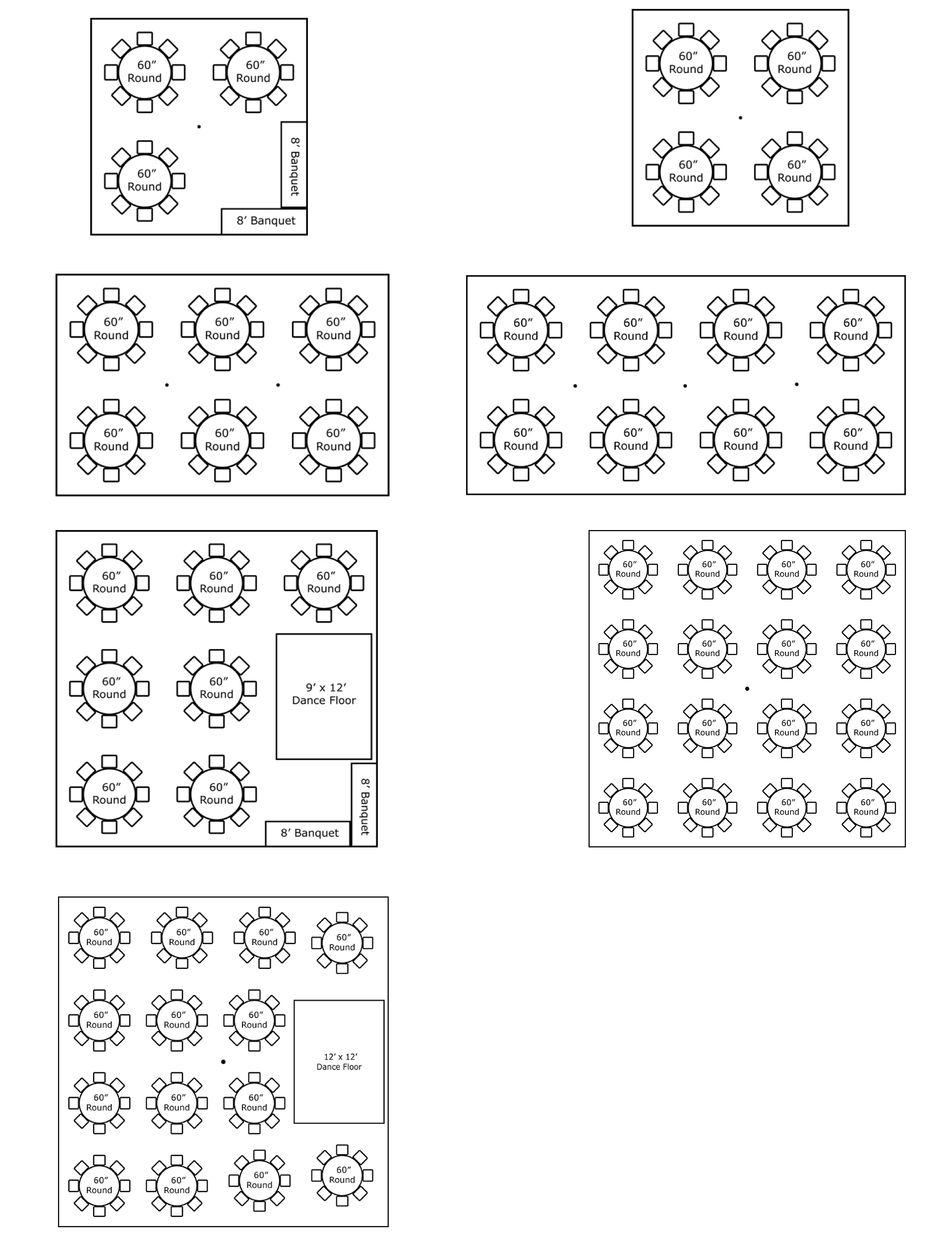 Discover the perfect setup for your next event with our 60-inch round tables. Ideal for any gathering, they comfortably seat 8-10 guests. Check out our new floor plans and seating layouts on our website, designed for easy event planning and space optimization. Start planning with The Event Suppliers LLC today for a seamless and elegant event experience