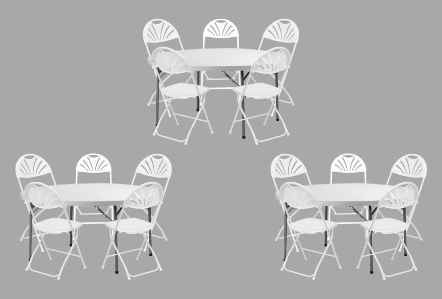 Our chair rental service is designed to provide you with high-quality seating solutions that cater to any event size. With our 3 Round and 15 White Fanback Chairs package, you get: