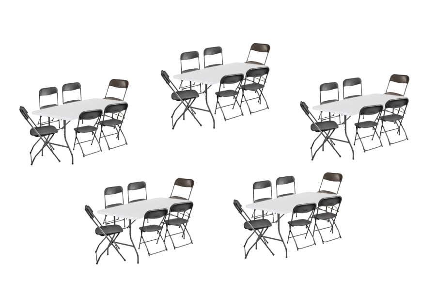 Planning a party for 30-40 guests and need a seating solution? Our package includes five long tables and 30 sleek black chairs, making it a perfect choice for your event.