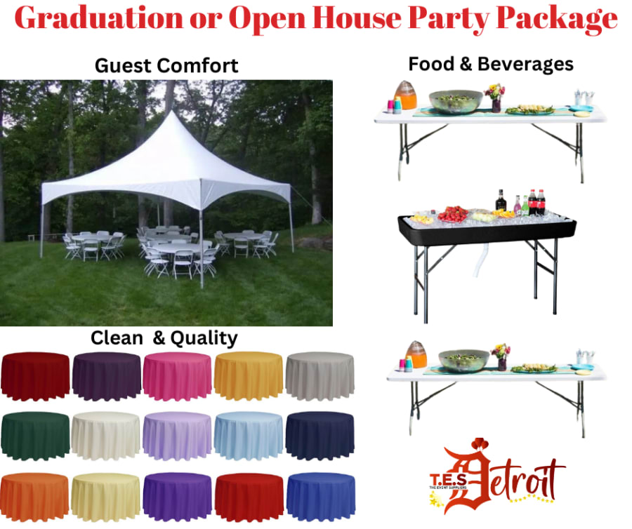 Celebrate your graduate in style with high-quality graduation party rentals from The Event Suppliers LLC. Our packages include everything you need to make your event a success, including a 20 x 20 frame tent, round tables that seat 8-10 guests, an 8ft food table or gift table, white folding chairs, and an ice table to keep your beverages cold.