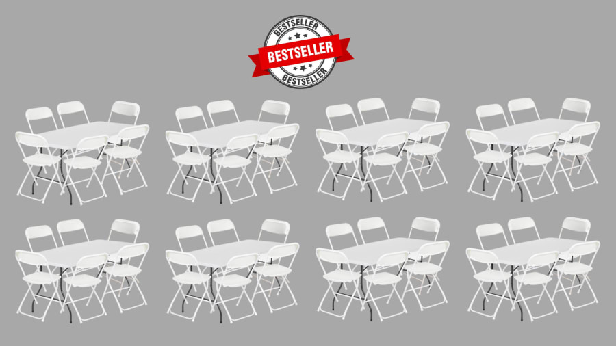 Our thoughtfully curated package includes 8 spacious long tables and 48 elegant white folding chairs, offering a stylish and comfortable solution for sizable events and gatherings.