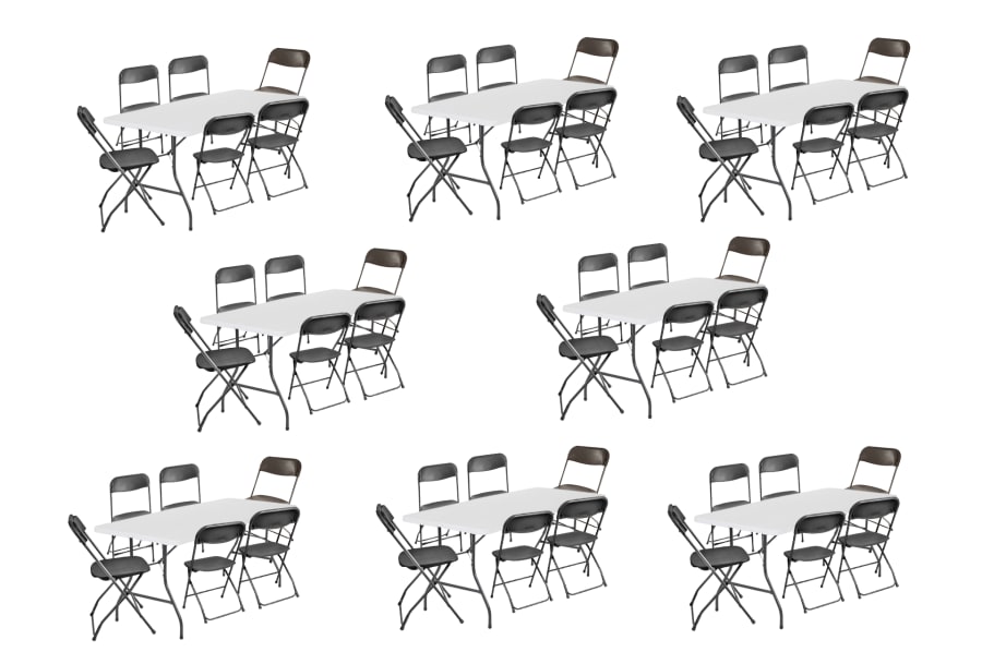 Hosting a party with 50-60 guests? Our Large Long Table Package is the perfect solution for your seating needs. This package includes eight long tables and 48 black folding chairs, providing ample seating for your guests.