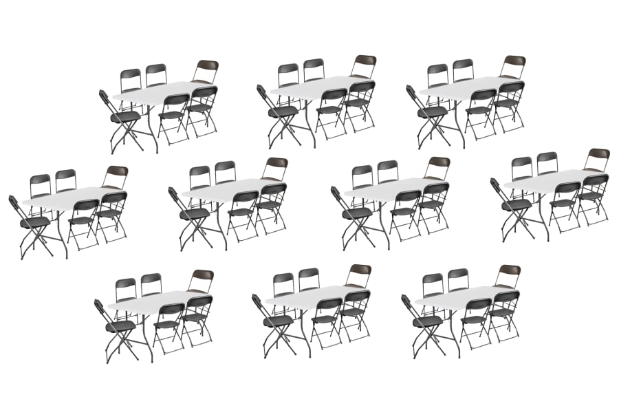 Our X-Large Long Table Package is the perfect solution for hosting events with 60-70 guests. This comprehensive bundle features 10 spacious long tables and 60 stylish black chairs, ensuring your party is fully equipped to provide a comfortable and enjoyable experience for everyone in attendance.