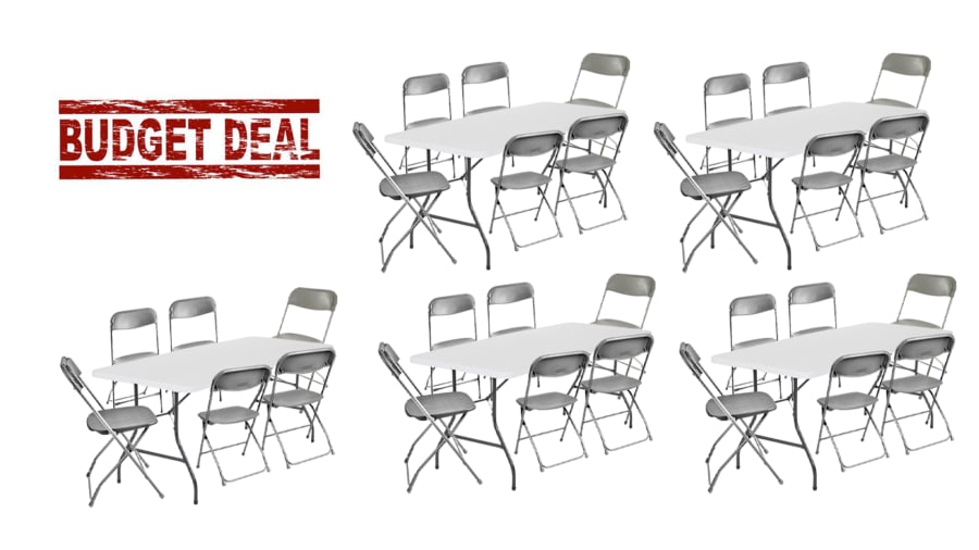 Looking for a convenient seating option for your upcoming party with 30-40 guests? Our package includes five long tables and 30 standard folding chairs, making it the perfect solution for your event.